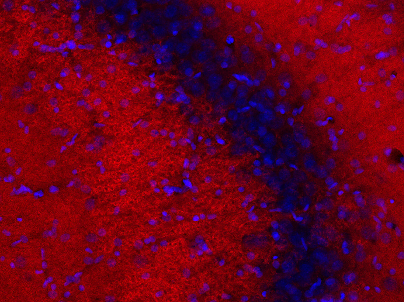 Figure 1: Indirect immunostaining of free floating PFA-fixed rat hippocampus (CA3) vibratome section with FluoTag-X2 anti-PSD95 Sulfo-Cyanine 3 (cat. no. N3702-SC3-L, dilution 1 : 500, red). Nuclei have been visualized by DAPI staining (blue).