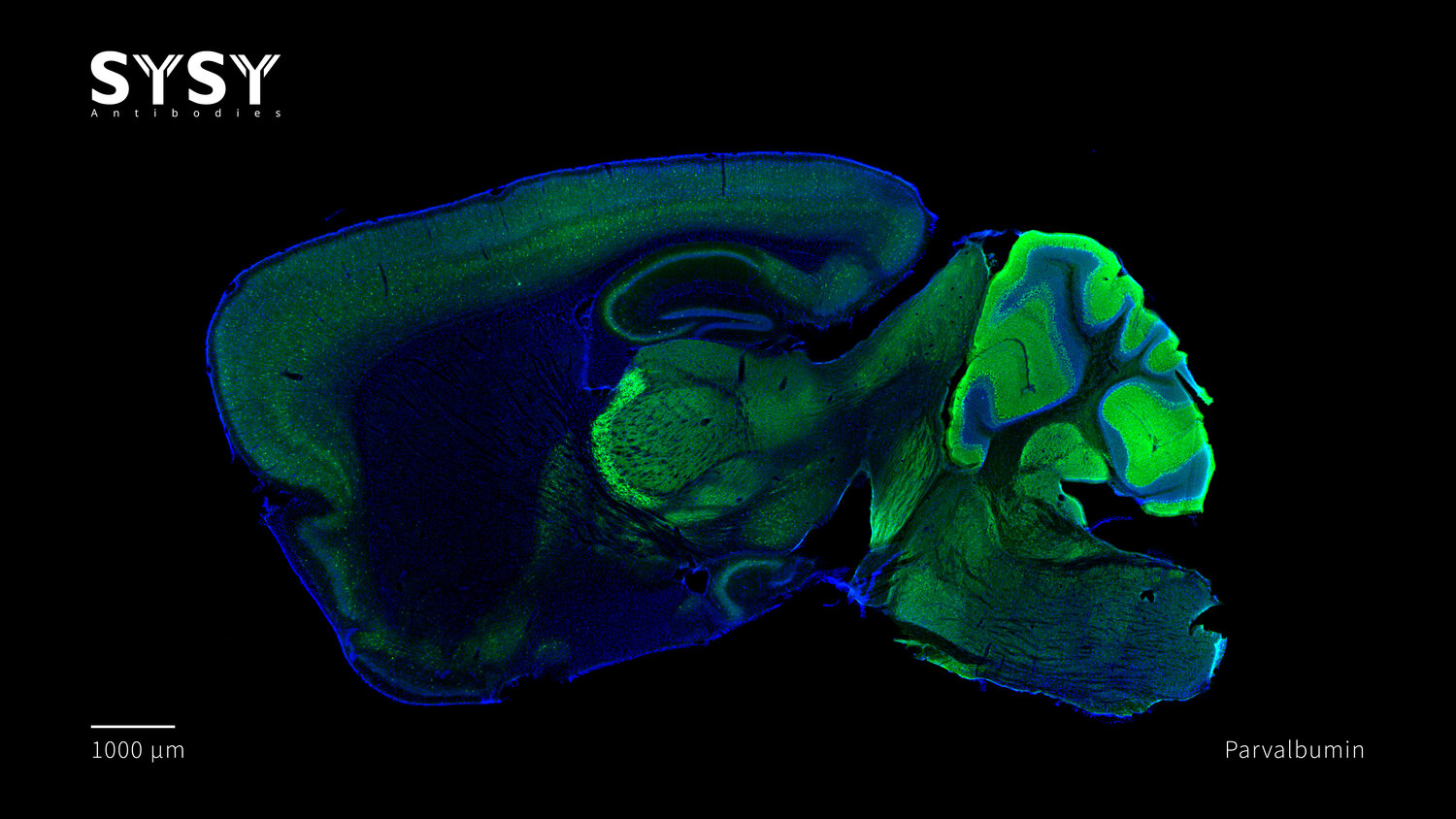 Indirect immunostaining of formaldehyde fixed sagittal mouse brain section with rabbit anti-Parvalbumin antibody (cat. no. 195 008, dilution 1 : 500).