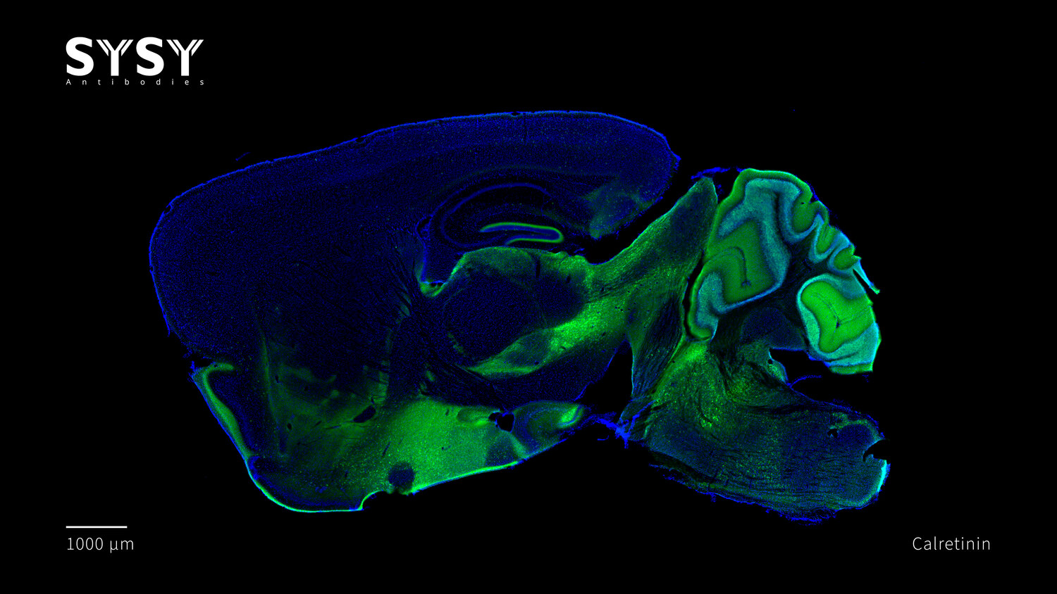 Indirect immunostaining of a formaldehyde fixed sagittal mouse brain section with guinea pig anti-Calretinin antibody (cat. no. 214 308, dilution 1 : 500).