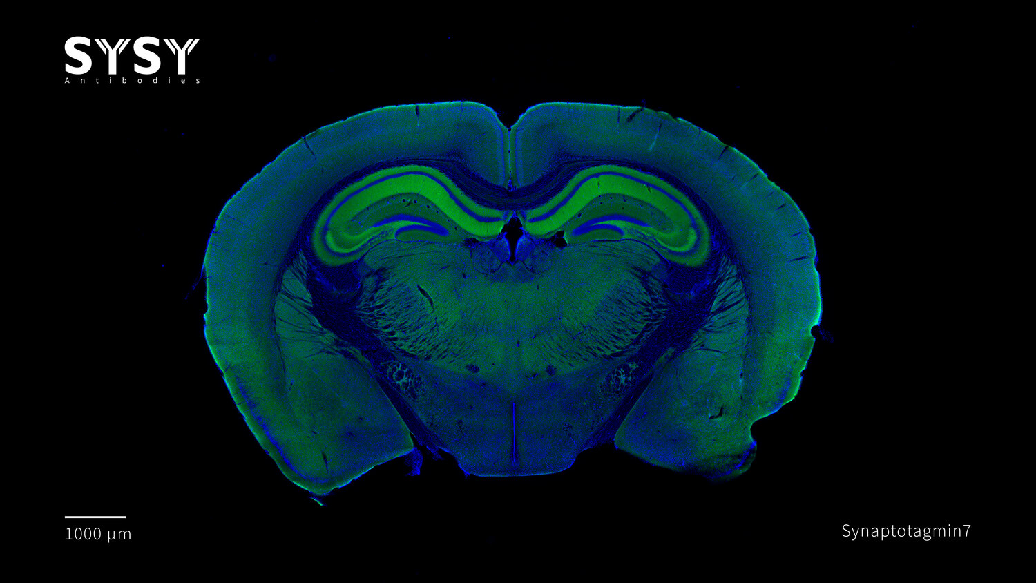 Indirect immunostaining of a formaldehyde fixed coronal mouse brain section with mouse anti-Synaptotagmin7 antibody (cat. no. 105 711, dilution 1 : 500).