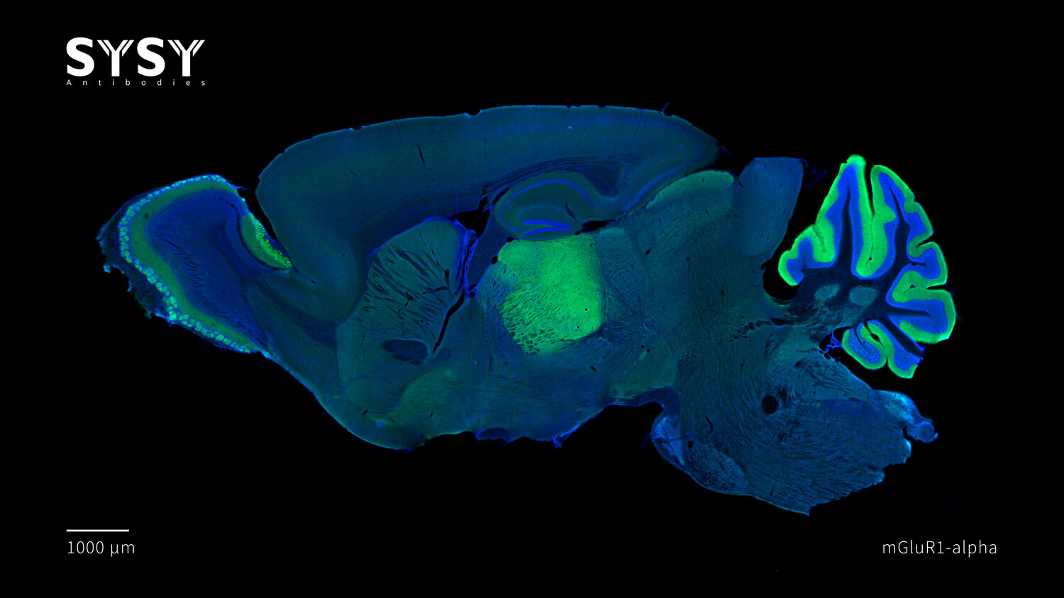 Indirect immunostaining of formaldehyde fixed sagittal mouse brain section with rabbit anti-mGluR1-alpha (cat. no. 191 003, dilution 1 : 500).