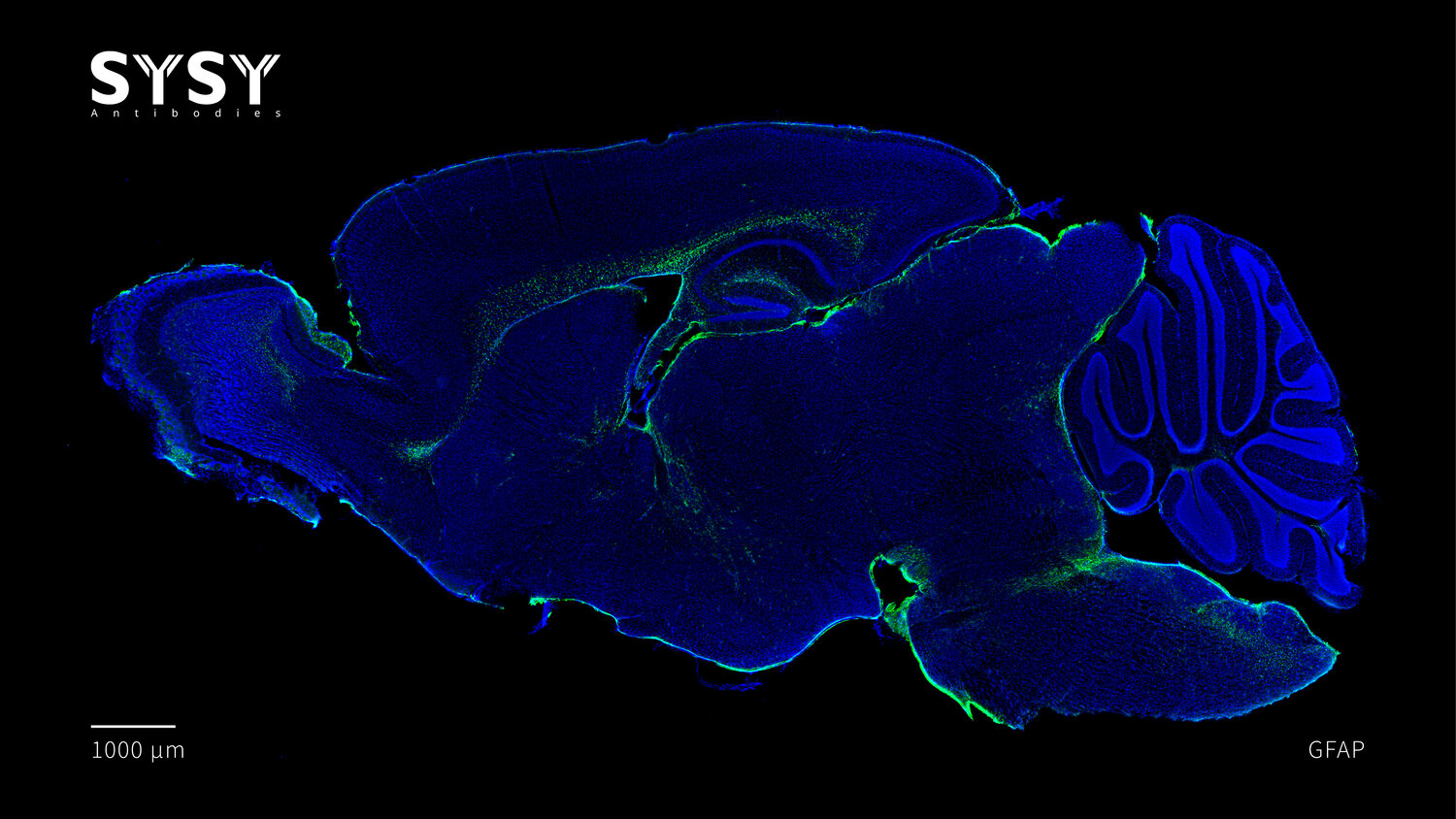 Indirect immunostaining of formaldehyde fixed sagittal mouse brain section with rabbit anti-GFAP (cat. no. 173 008, dilution 1 : 2000).