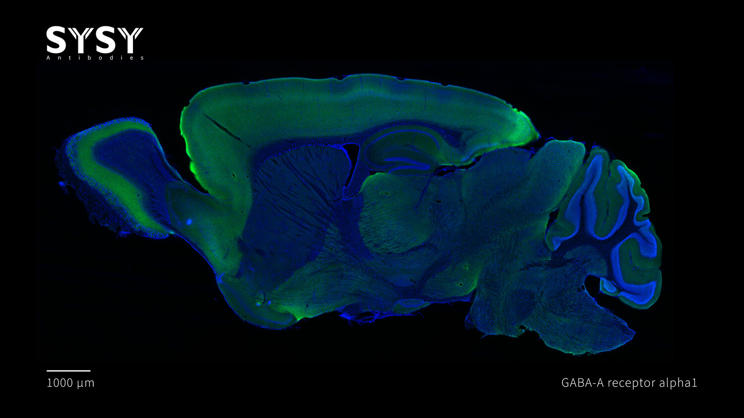 Indirect immunostaining of a formaldehyde fixed sagittal mouse brain section with mouse anti-GABA-A receptor alpha1 antibody (cat. no. 224 211, dilution 1 : 500).