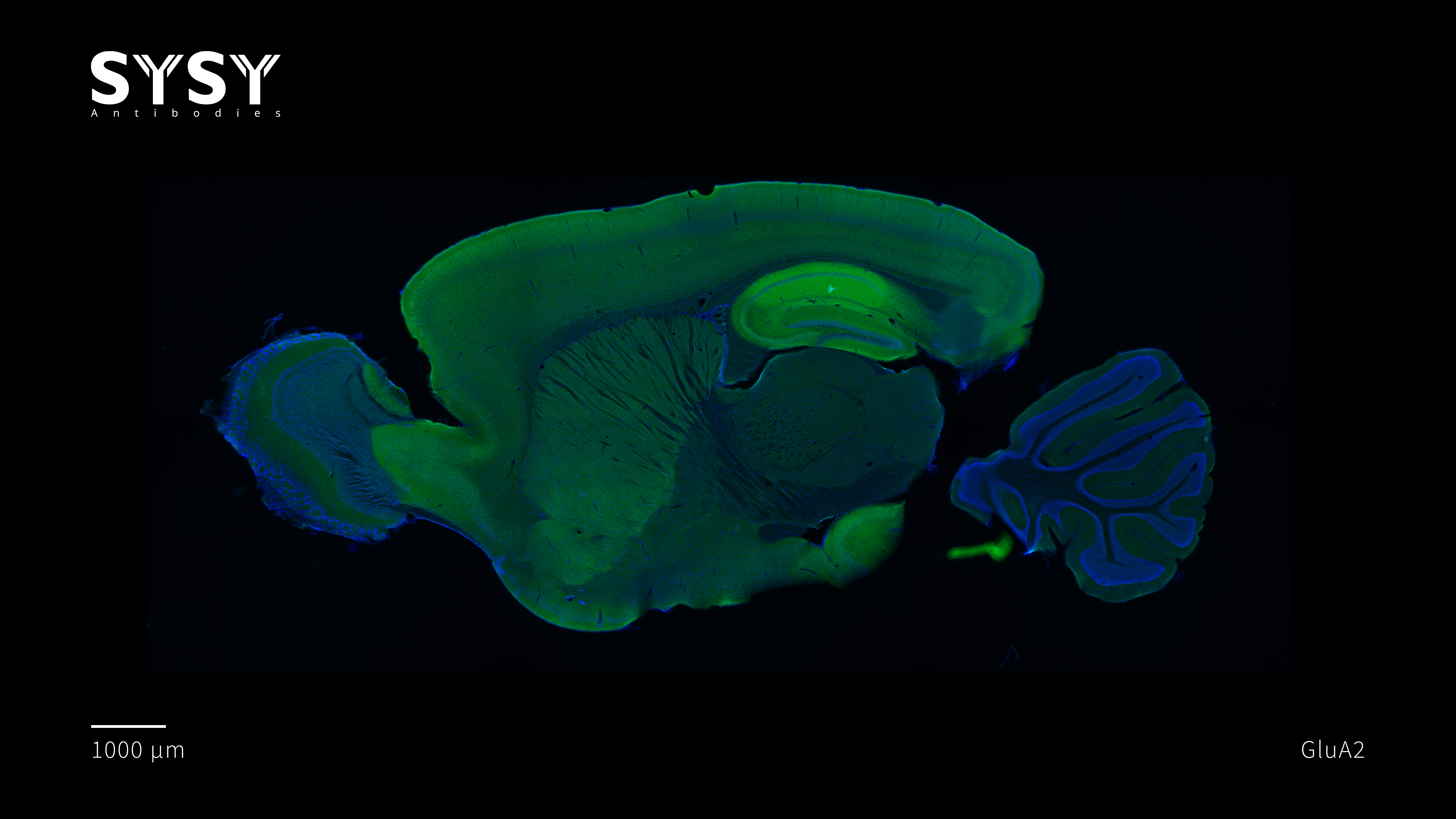 Indirect immunostaining of a formaldehyde fixed sagittal mouse brain section with rat anti-GluA2 antibody (cat. no. 182 117, dilution 1 : 200).