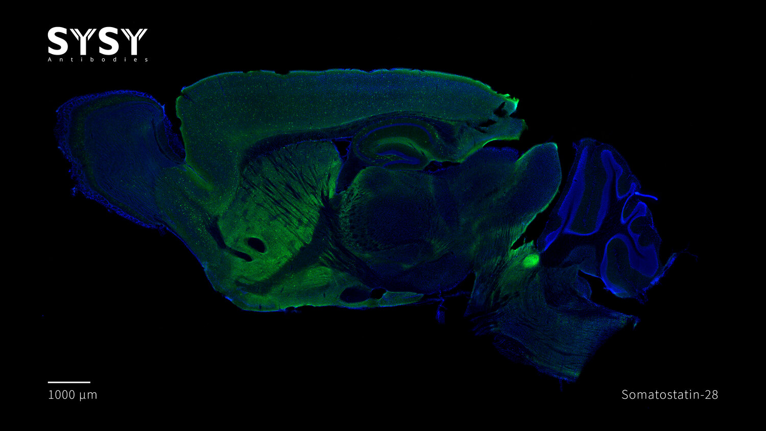 Indirect immunostaining of a formaldehyde fixed sagittal mouse brain section with rat anti-Somatostatin-28 antibody (cat. no. 366 017, dilution 1 : 500).