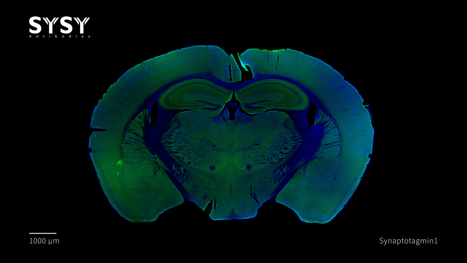 Indirect immunostaining of a formaldehyde fixed coronal mouse brain section with mouse anti-Synaptotagmin1 antibody (cat. no. 105 011, dilution 1 : 500).