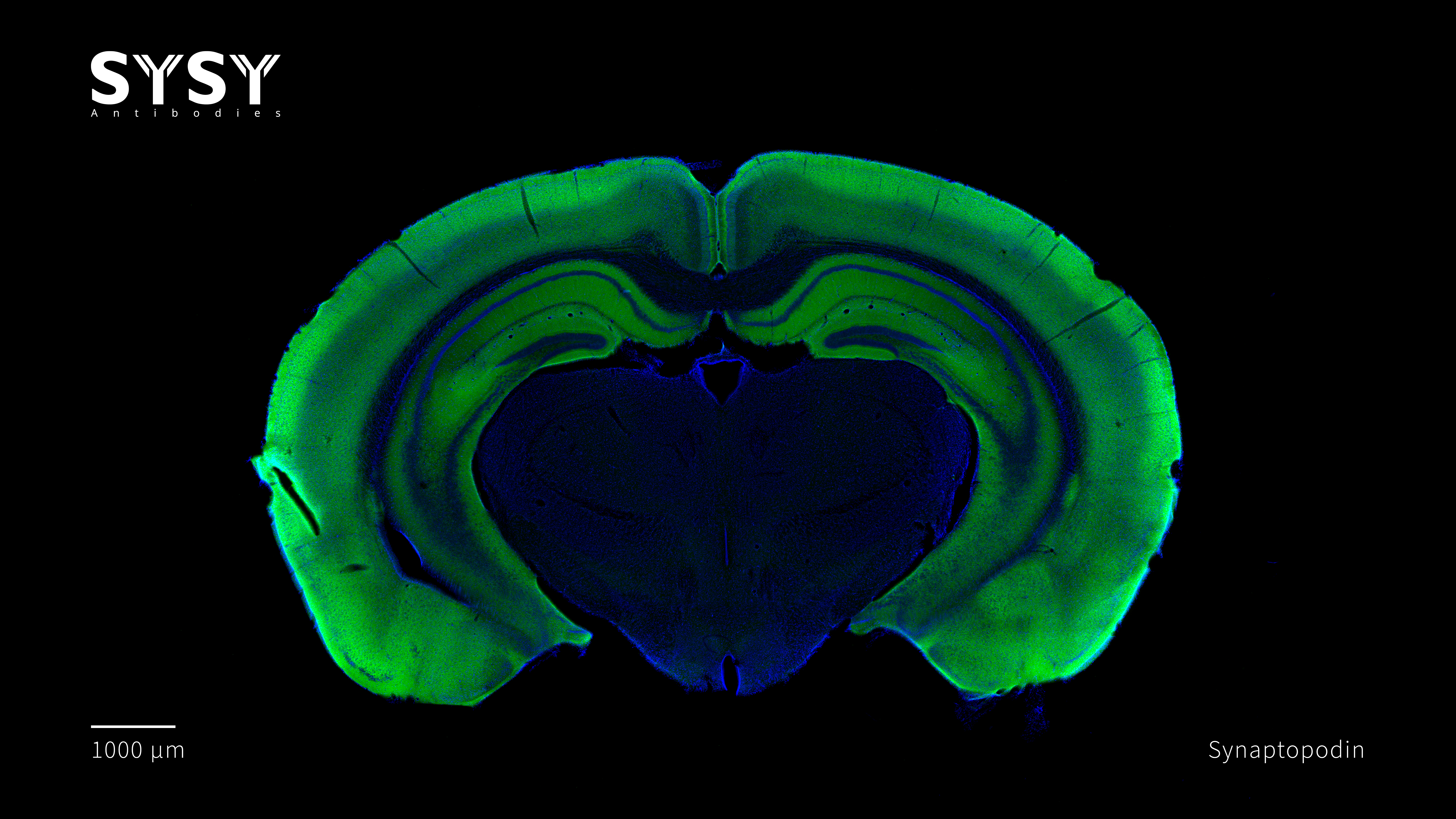 Indirect immunostaining of a formaldehyde fixed coronal mouse brain section with mouse anti-Synaptopodin antibody (cat. no. 163 011, dilution 1 : 500).