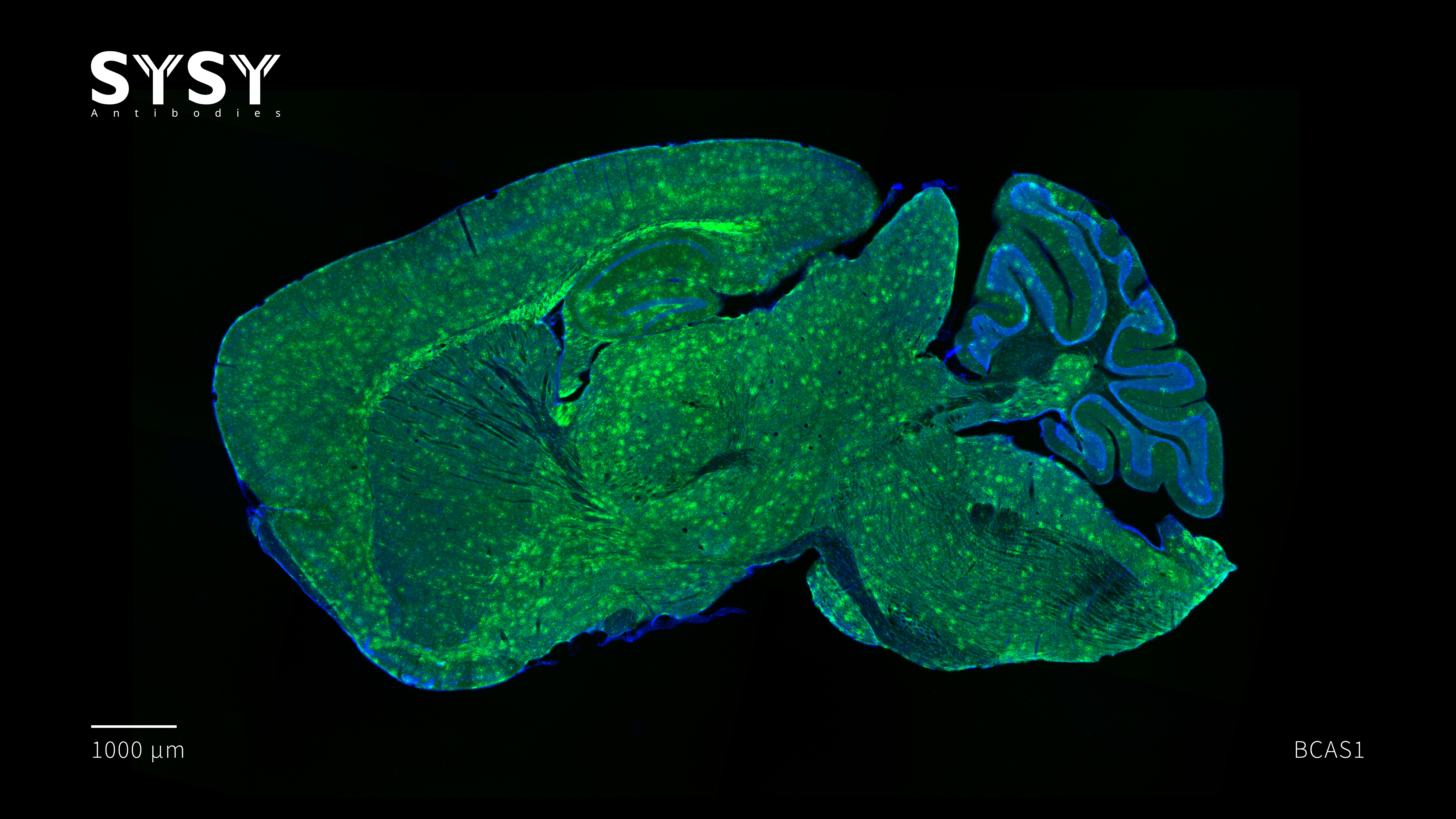 Indirect immunostaining of a formaldehyde fixed sagittal mouse brain section with rabbit anti-BCAS1 antibody (cat. no. 445 008, dilution 1 : 1000).