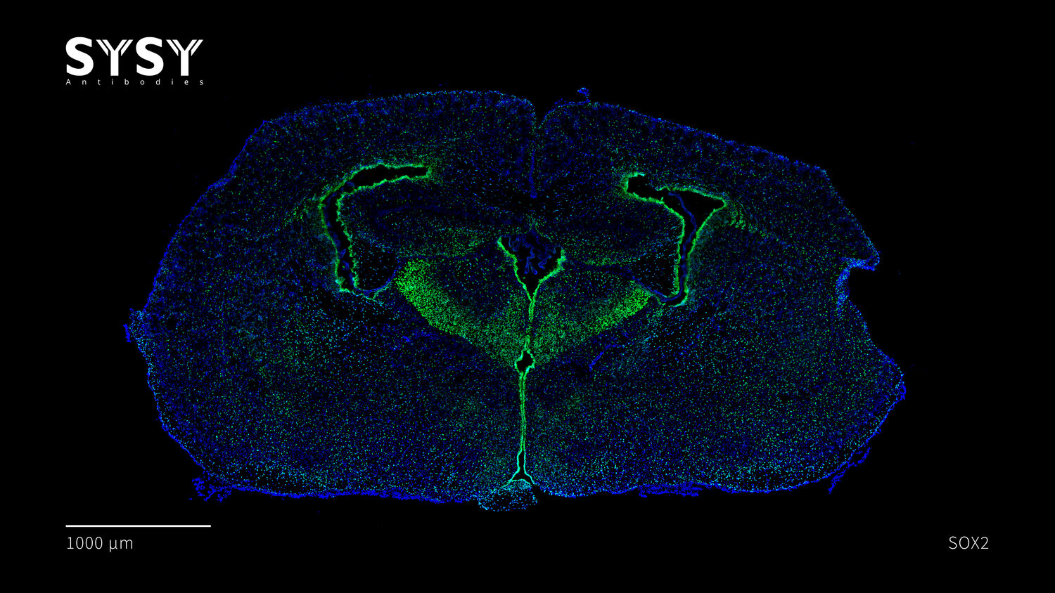 Indirect immunostaining of a formaldehyde fixed coronal newborn mouse brain section (P0) with rabbit anti-SOX2 antibody (cat. no. 347 003, dilution 1 : 500).