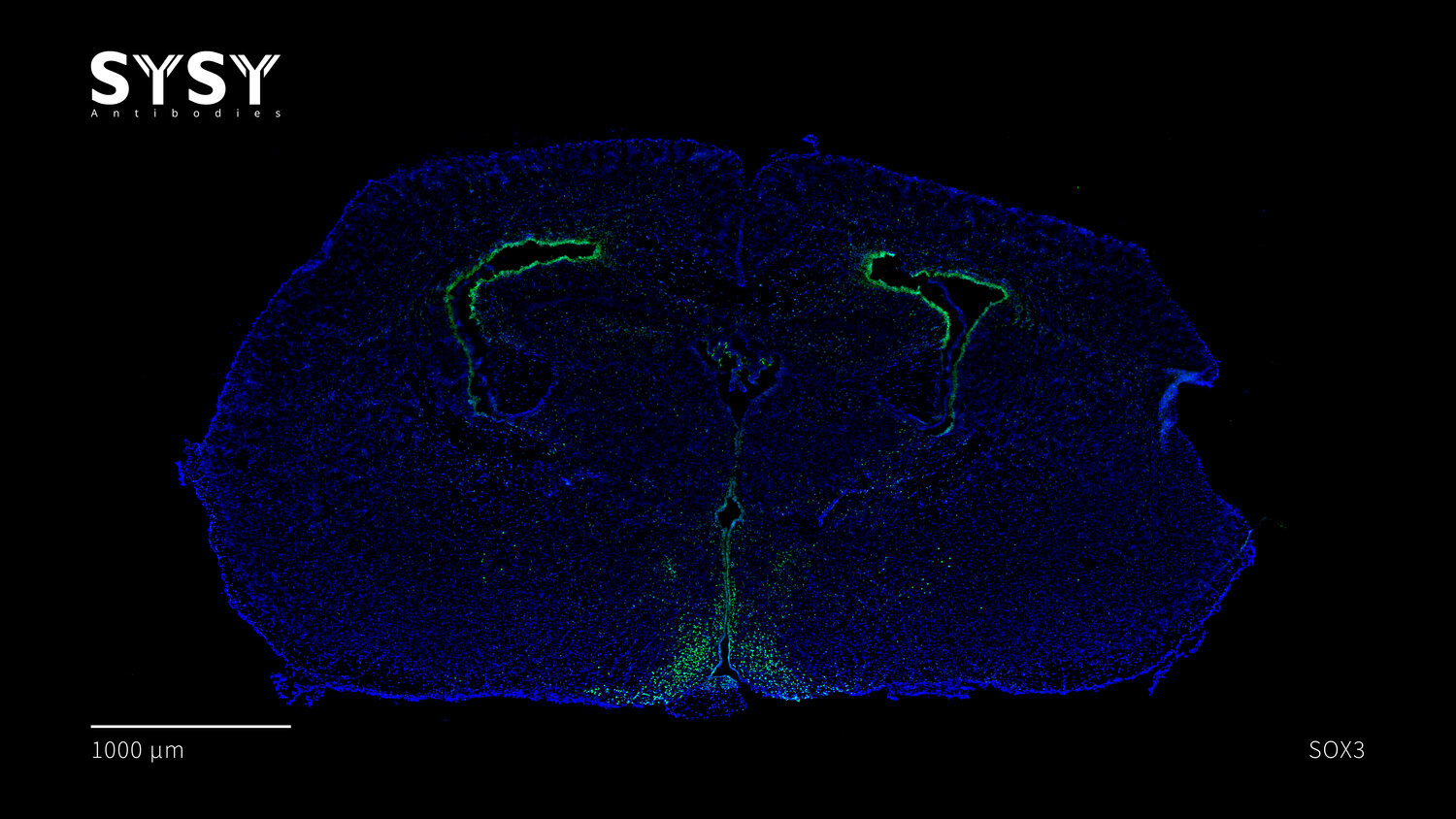 Indirect immunostaining of a formaldehyde fixed coronal newborn mouse brain section (P0) with guinea pig anti-SOX3 antibody (cat. no. 347 304, dilution 1 : 500).