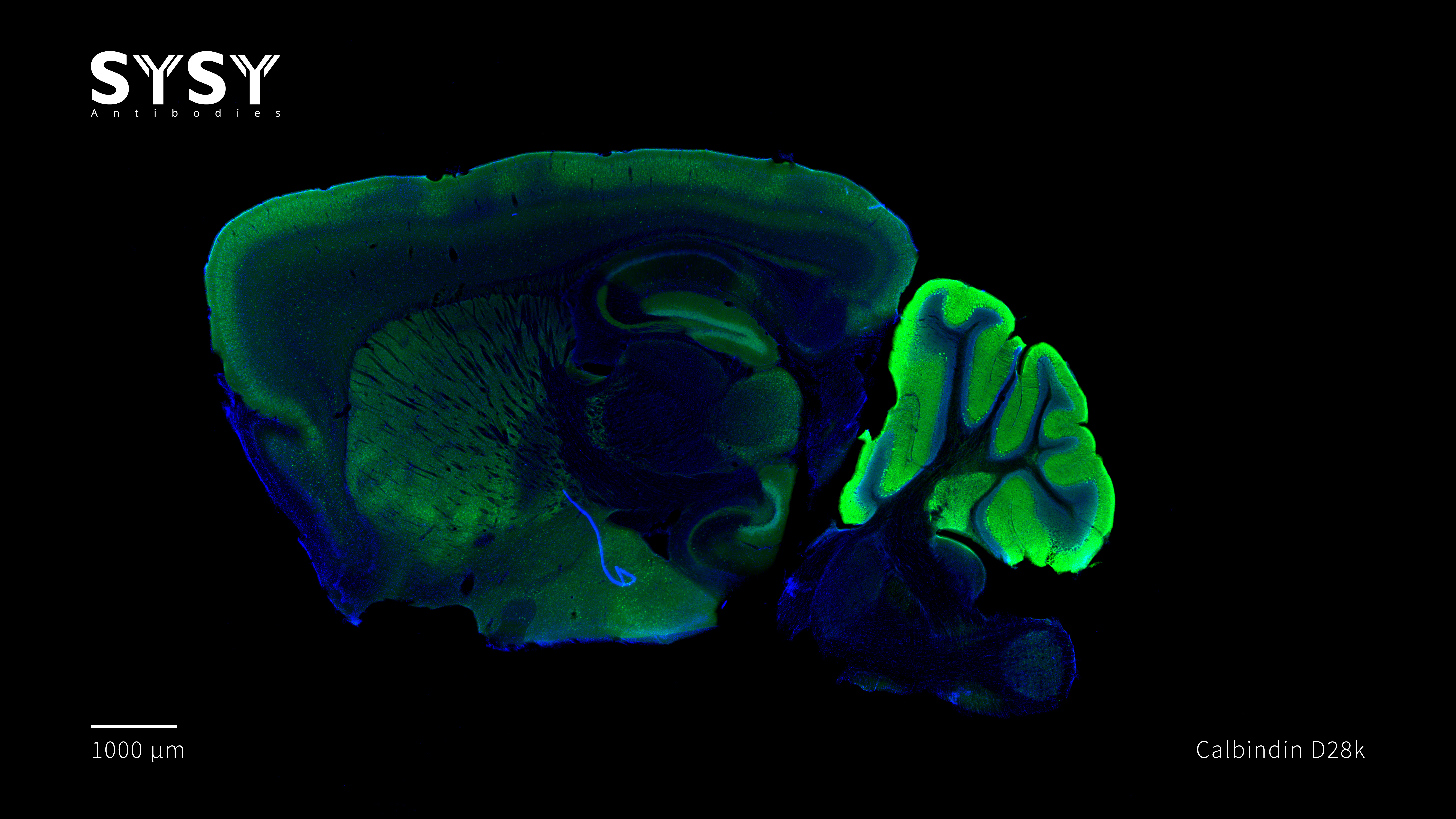 Indirect immunostaining of a formaldehyde fixed sagittal mouse brain section with rabbit anti-Calbindin D28k antibody (cat. no. 214 008, dilution 1 : 500).