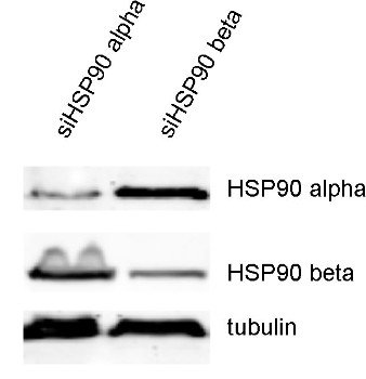 图3:用多克隆兔抗-HSP90 α抗体(cat. no.: 380 003)和多克隆兔抗-HSP90 β抗体 (cat. no.: 380 103)在野生型和基因敲落HeLaT-Rex 细胞中检测HSP90 α和β。