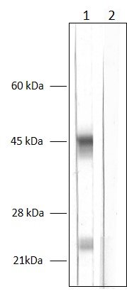 图1:用多克隆豚鼠抗体cat. no. 443 004 在小鼠脾脏匀浆中检测Chil3/YM1。条带1:Chil3/YM1抗体(稀释比例,1:1000)。条带2:用5 µg 免疫原阻断Chil3/YM1抗体(稀释比例,1:1000。