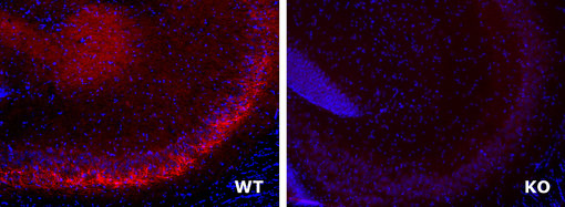 图2:用豚鼠抗体LAMP5 (cat. no.: 412 005, 稀释比例 1:500; 红色)对经PFA固定的野生型和基因敲除小鼠脑切片进行免疫染色。细胞核由DAPI染色可见为蓝色。