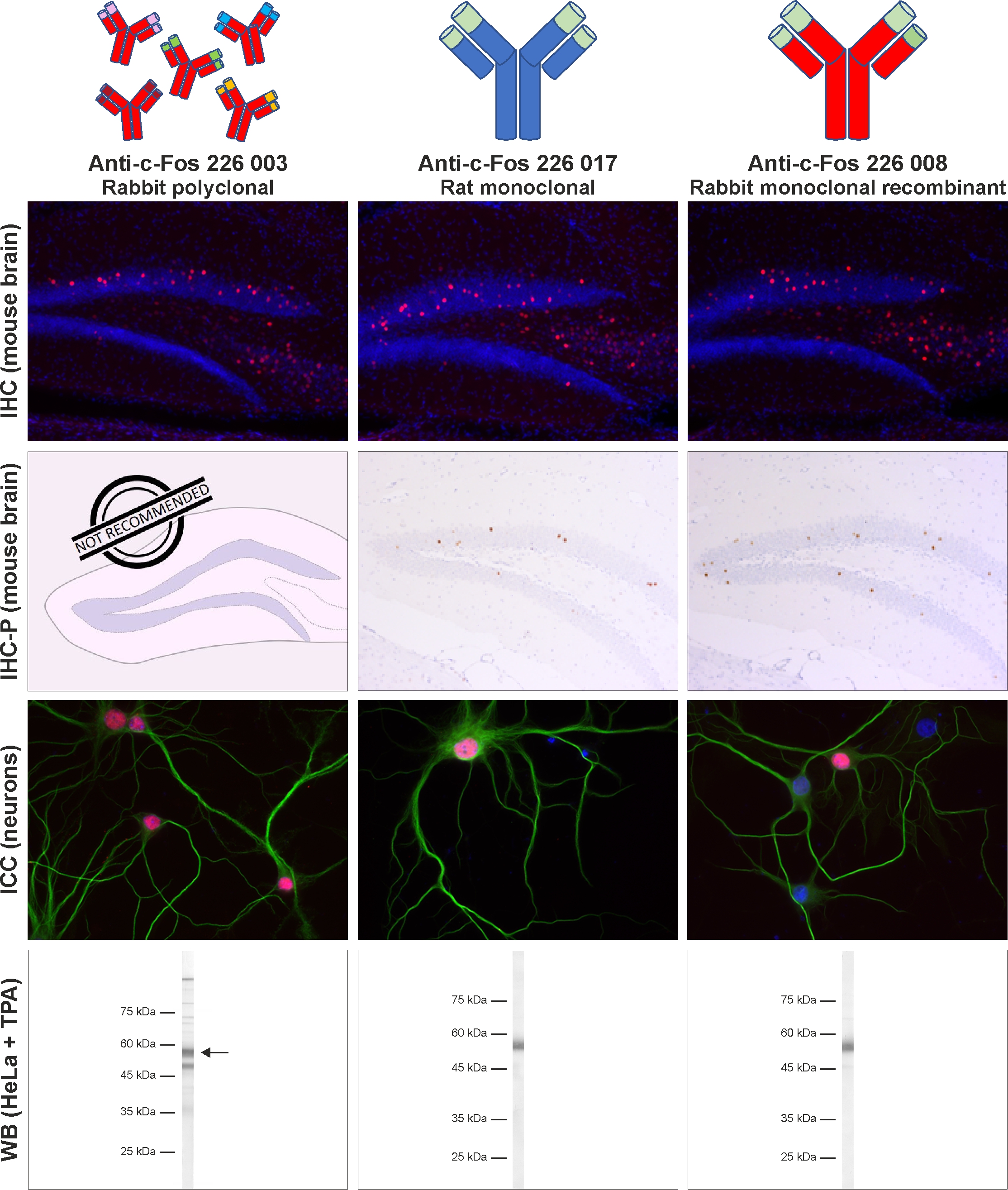图4:单克隆重组兔抗- c-Fos抗体226 008在我们所有的标准应用中都表现优异。重组兔抗- c-Fos抗体226 008与单克隆大鼠抗c-Fos抗体226 017和多克隆兔抗c-Fos抗体226 003在相同试验条件下相比。在IHC和IHC-P试验中,c-Fos抗体可用于小鼠和大鼠海马体切片的间接免疫染色(小鼠切片显示;IHC:c-Fos = 红色,DAPI = 蓝色;IHC-P:c-Fos = 棕色,苏木精 = 蓝色)。在ICC试验中,c-Fos抗体可用于大鼠海马体神经元的间接免疫染色(c-Fos = 红色,MAP 2 188 011/188 002 = 绿色,DAPI = 蓝色)。在免疫印迹试验中,c-Fos可从TPA刺激的HeLa细胞的核提取物中检测到(检测方法:AP染色)。