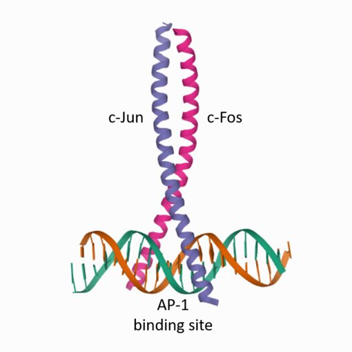 图1:异质二聚体bZIP转录因子c-Fos/c-Jun与DNA结合的图例说明 (改编自Glover and Harrison, 1995 and PDB 1FOS)。