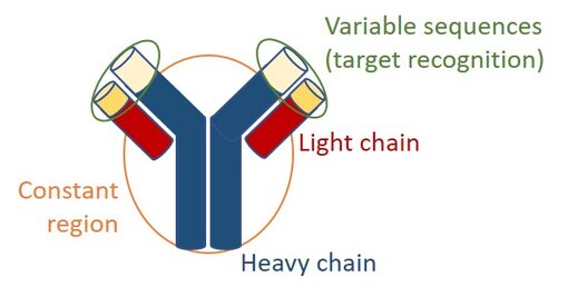 图2:抗体结构。抗体由两条重链和两条轻链组成。所有重链和轻链包含物种特异性恒定区和负责目标识别的可变序列。