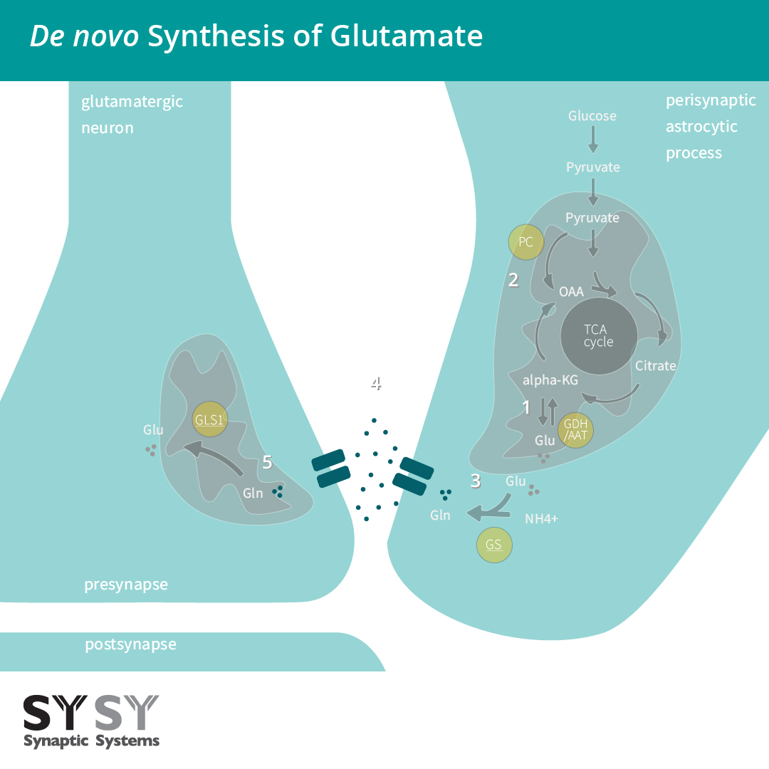 (1) 谷氨酸(Glu) 被释放后 ,跟离子通道型及代谢型受体结合(AMPAR/GluA、KainateR/GluK、NMDAR/GluN、mGluRs)。(2) 谷氨酸主要由星形胶质细胞通过兴奋性氨基酸转运蛋白EAAT 1/2 移除,部分由神经元通过EAAT 3移除。(3) 星形胶质细胞谷氨酰胺合成酶将谷氨酸(Glu)转化为谷氨酰胺(Gln)。(4) 突触惰性谷氨酰胺被从星形胶质细胞转运至神经元。(5)谷氨酰胺(Gln)由线粒体谷氨酰胺酶1 (GLS1)转化回谷氨酸(Glu)。(6) 谷氨酸被囊泡谷氨酸转运蛋白(VGLUTs)转移至囊泡,为下一轮的传递而准备。