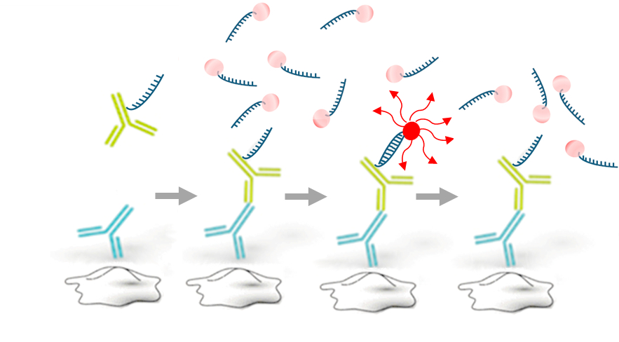 When a dye-labeled imager transiently hybridizes to a docking strand in DNA-PAINT imaging buffer, fluorescent signal or “blinking” occurs. To create a super-resolution image, a camera captures blinking over a period of time (10 – 50 min) and the resulting image is post-processed using the Picasso data analysis software – a free software developed for DNA-PAINT image analysis.