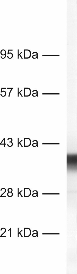 This antibody is a chimeric antibody based on the monoclonal mouse antibody clone 44E3D12. The constant regions of the heavy and light chains have been replaced by rabbit specific sequences. Therefore, the antibody can be used with standard anti-rabbit secondary reagents. The antibody has been expressed in mammalian cells. |