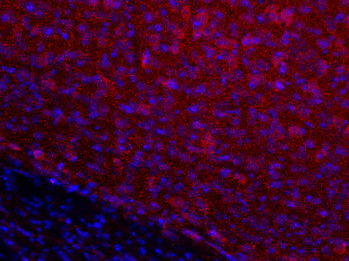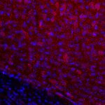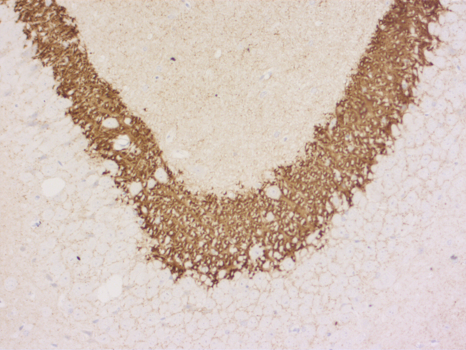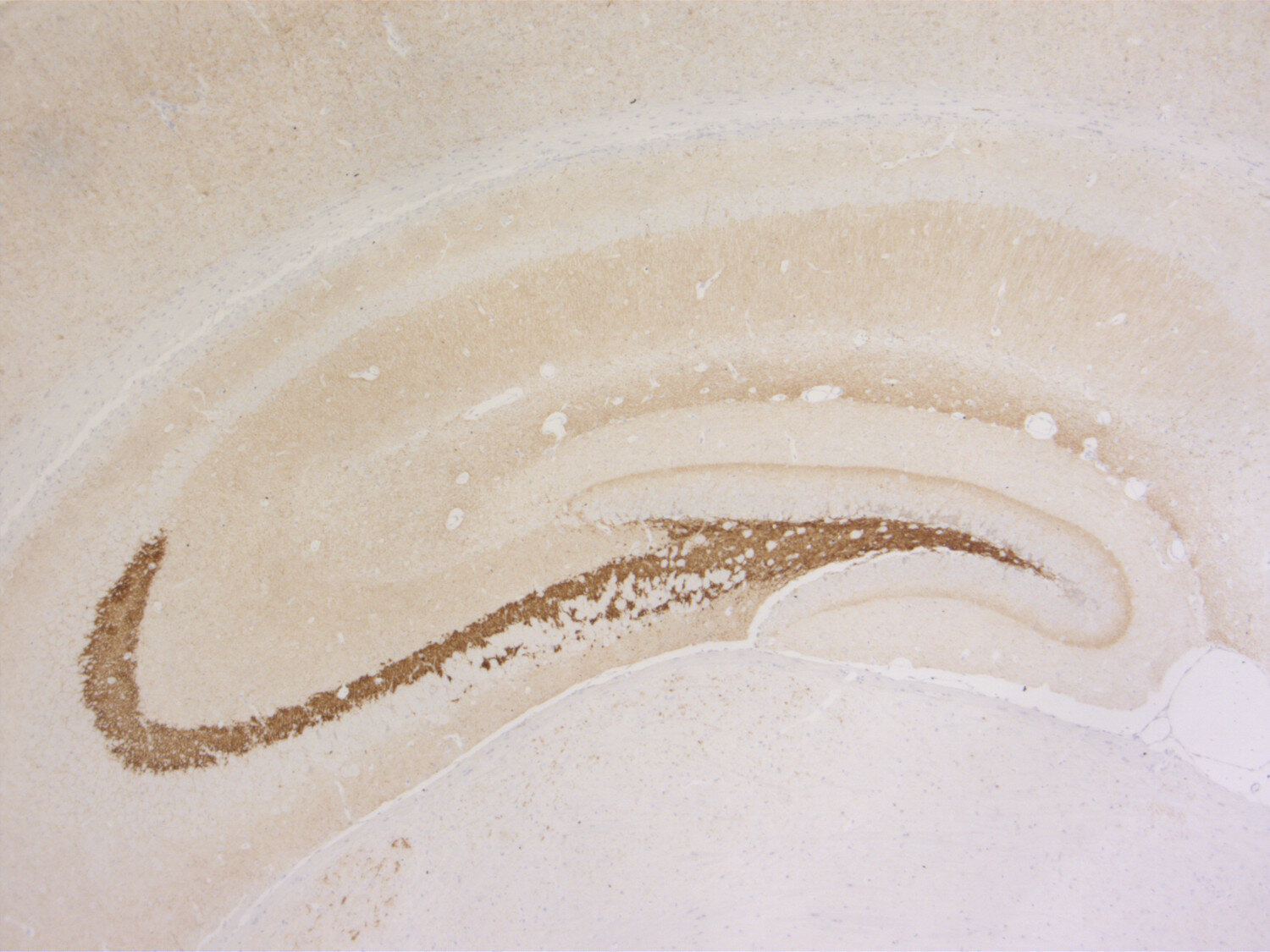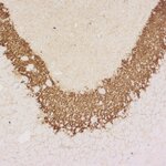 IHC: In addition to the expected strong mossy fiber staining, this antibody shows some weak unspecific staining of cell bodies in the cortex, striatum and cerebellum. |
