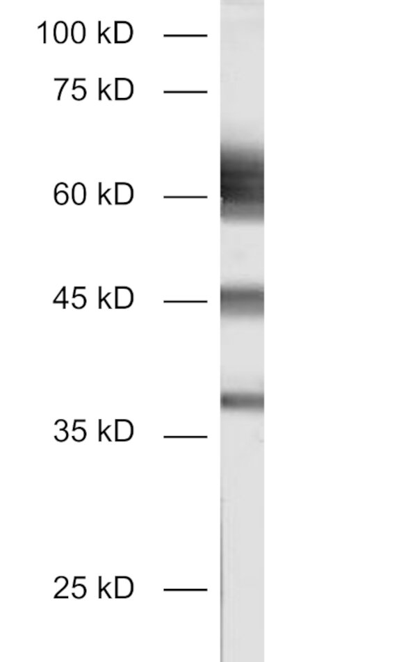 This antibody is a chimeric antibody based on the monoclonal mouse antibody 41.1. The constant regions of the heavy and light chains have been replaced by chicken specific sequences. The antibody can therefore be used with standard anti-chicken secondary reagents. The antibody has been expressed in mammalian cells. |