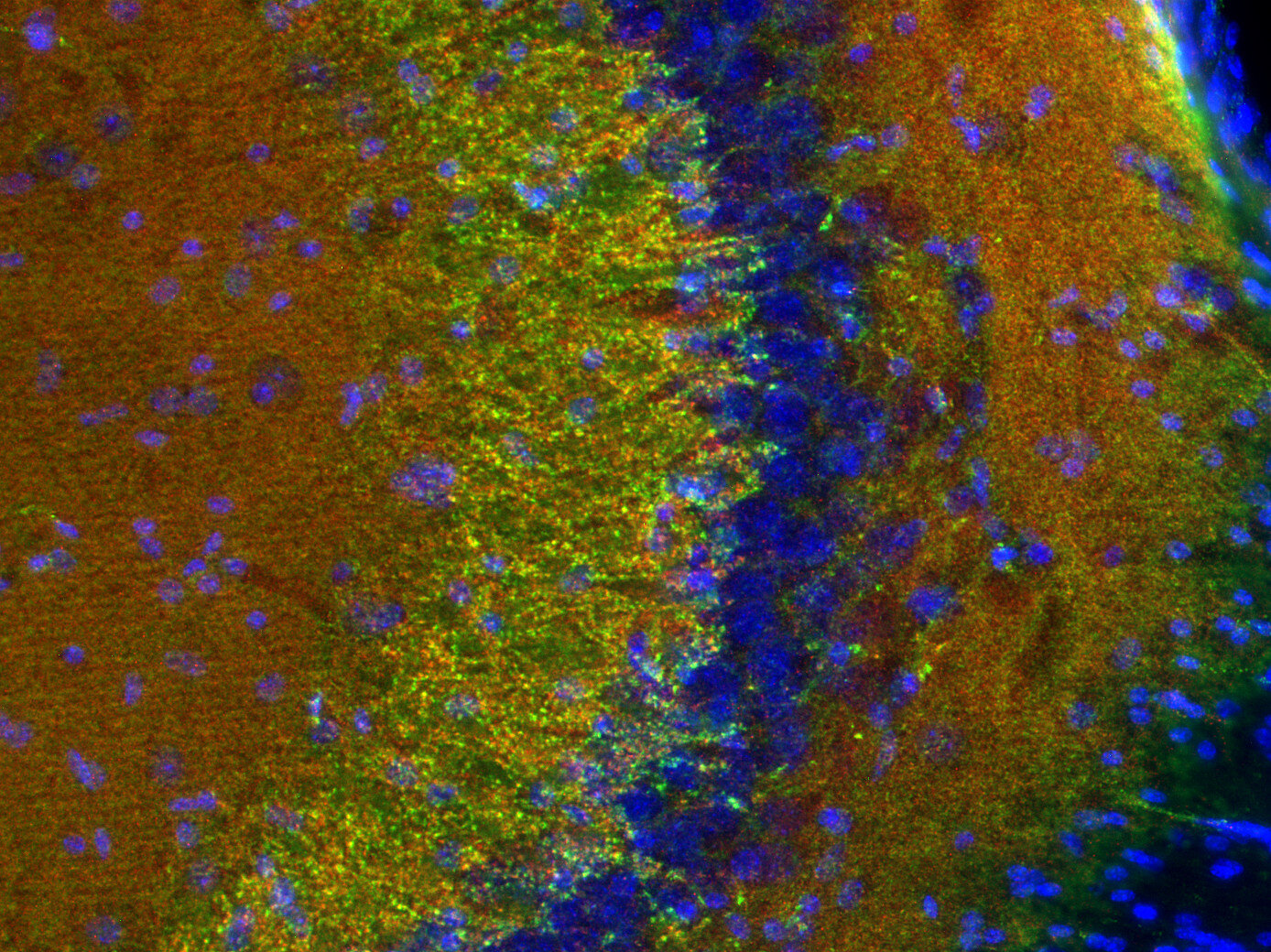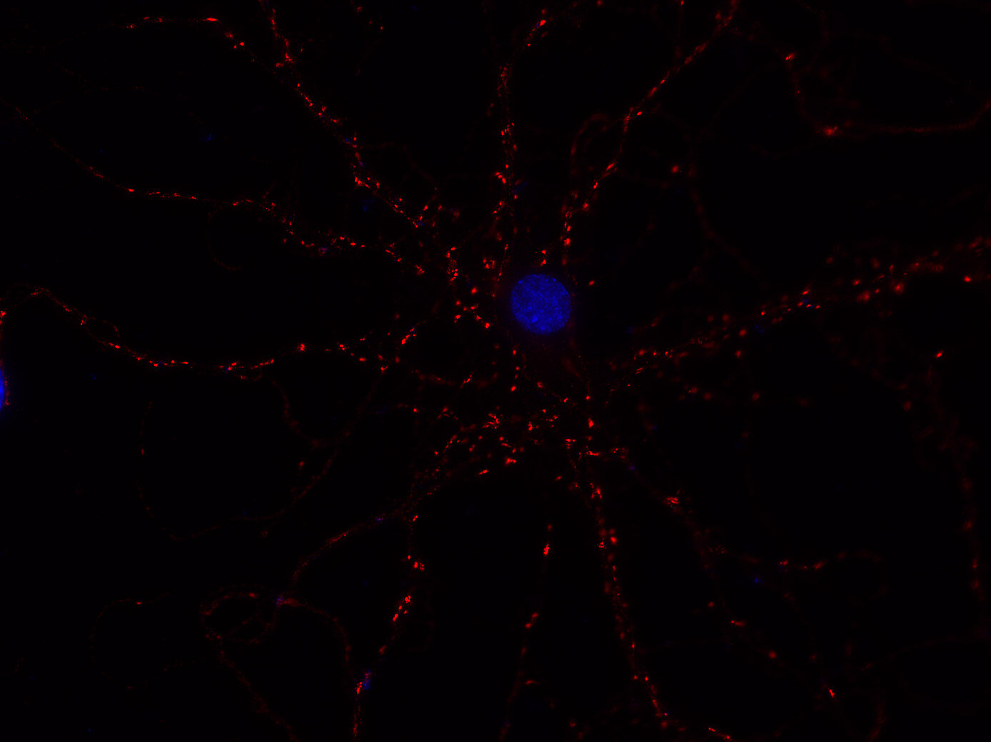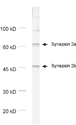 Synapsin1 is one of the most specific markers of synapses throughout the central and peripheral nervous system. In addition to synaptic nerve terminals, the protein is also present in certain sensory nerve endings. It is expressed in two splice variants (synapsin1a and synapsin1b). Synapsin1 interacts with vesicle membranes as well as with actin and spectrin.