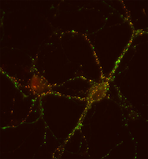 Synapsin 1 is one of the most specific markers of synapses throughout the central and peripheral nervous system. In addition to synaptic nerve terminals, the protein is also present in certain sensory nerve endings. It is expressed in two splice variants (synapsin 1a and synapsin 1b). Synapsin 1 interacts with vesicle membranes as well as with actin and spectrin.