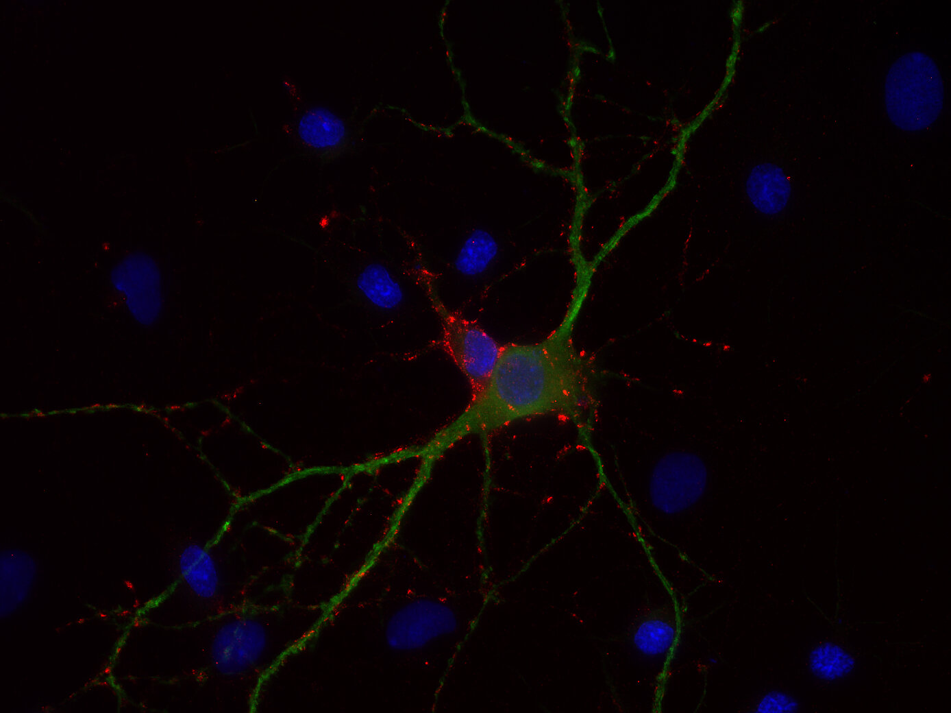 Unlike integral membrane proteins of synaptic vesicles, Rab3a and Rab3c are absent from the Golgi complex, preventing immunostaining of the axo-dendritic region, which can occur with proteins such as synaptophysin, synaptobrevin/VAMP, or synaptogyrin (1).