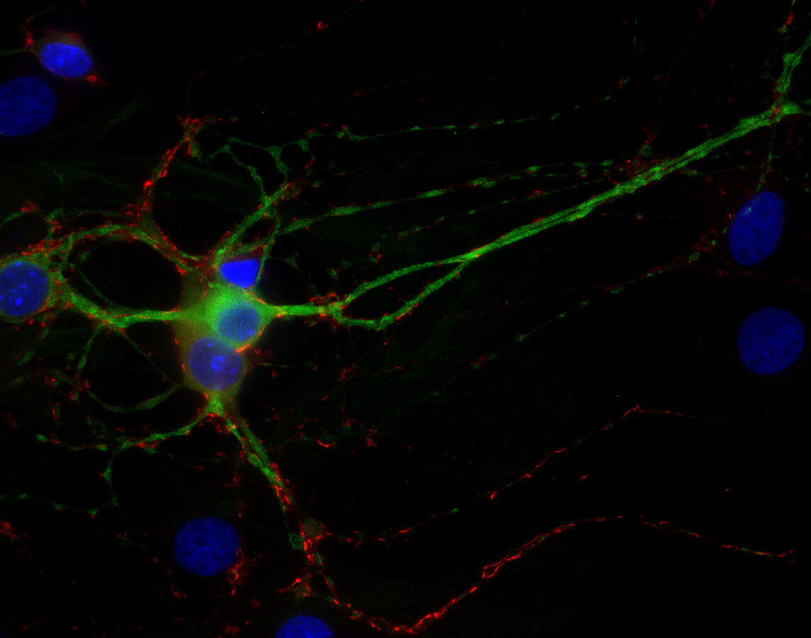 SV2s (Synaptic Vesicle Protein 2) are integral membrane glycoproteins present in synaptic vesicles. They have 12 transmembrane domains predicted by sequence analysis (1). There are three characterized isoforms, SV2 A, SV2 B and SV2 C that are similar in structure but show different expression patterns. SV2 A is expressed ubiquitously throughout the brain and plays a crucial role in modulating synaptic transmission by regulating the expression and trafficking of synaptotagmin, a key calcium sensor in neurotransmitter release (1).