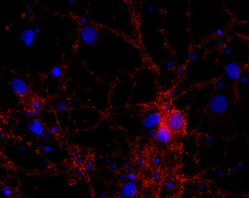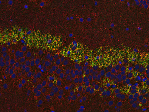 SV2s (Synaptic Vesicle Protein 2) are integral membrane glycoproteins present in synaptic vesicles. They have 12 transmembrane domains predicted by sequence analysis (1). There are three characterized isoforms, SV2 A, SV2 B and SV2 C that are similar in structure but show different expression patterns. SV2 A is expressed ubiquitously throughout the brain and plays a crucial role in modulating synaptic transmission by regulating the expression and trafficking of synaptotagmin, a key calcium sensor in neurotransmitter release (1).