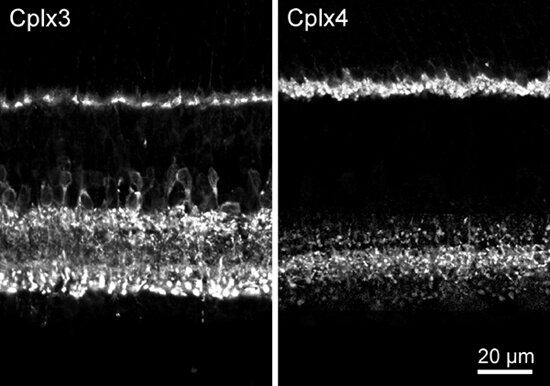 In retinal ribbon synapses complexin 3 and complexin 4 functionally replace complexin 1 and 2. They have similar biochemical binding properties and are farnesylated at their C-terminus.