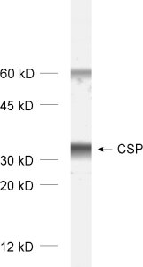 Cysteine String Proteins CSPs are composed of an N-terminal J-domain and a central palmitoylated cysteine string. This post-translational modification shifts the molecular weight of CSP 1 in brain from 23 kDa to 34 kDa and confers membrane targeting of the protein.
