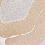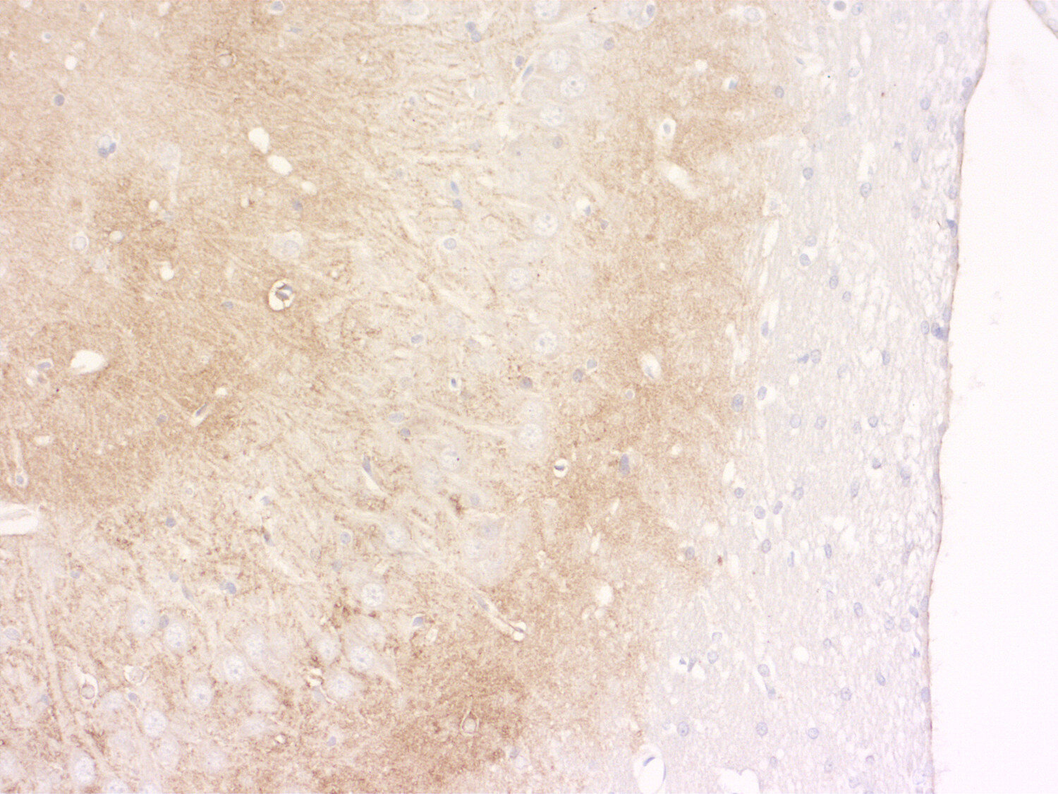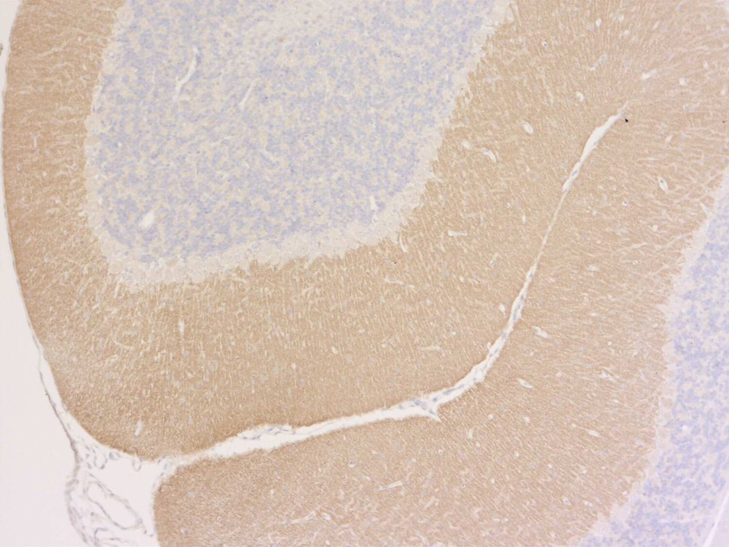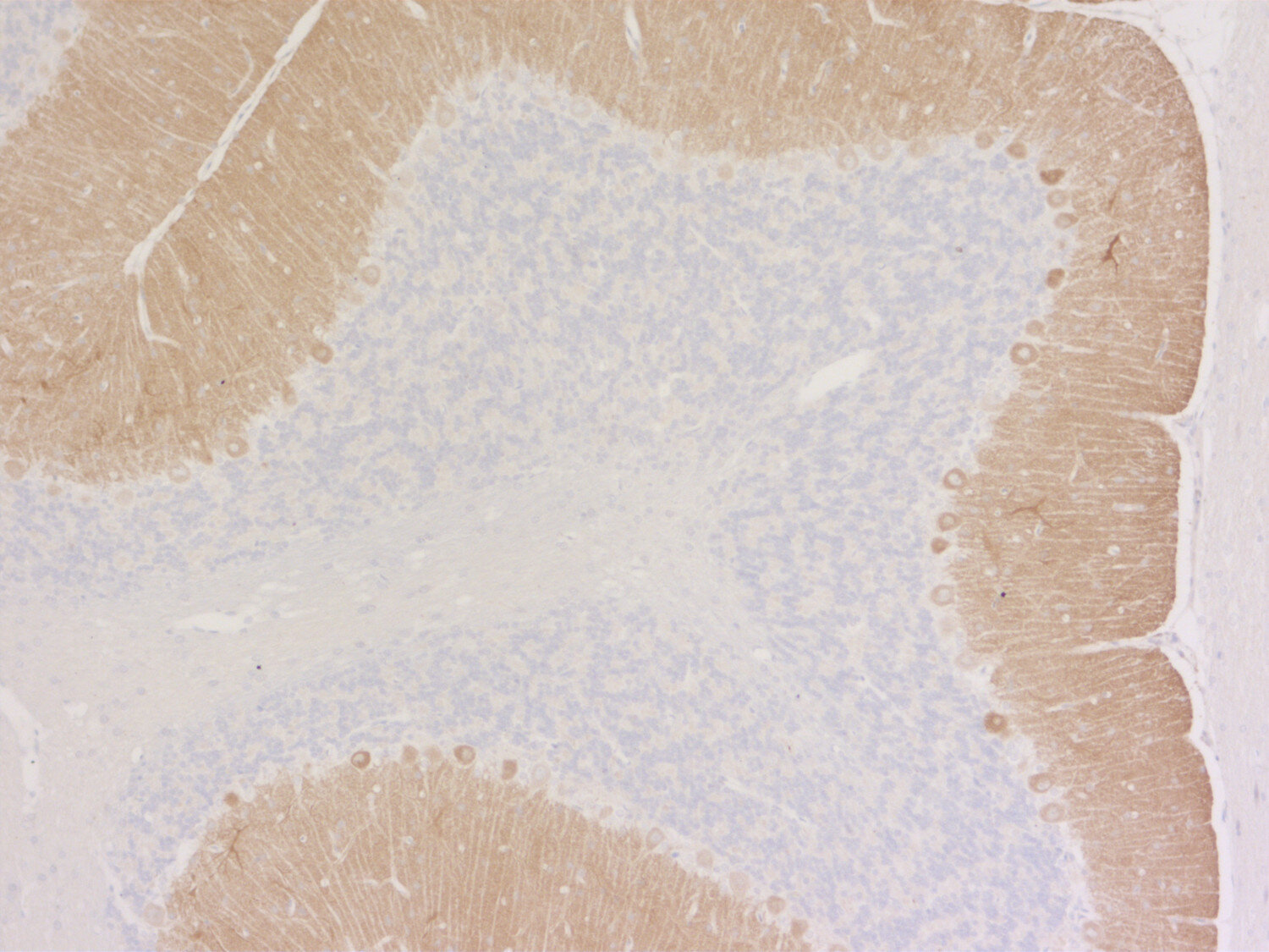 IHC-P: Antibody detects Purkinje cells in rat cerebellum. This staining is absent in mouse tissue and in standard IHC applications. |