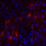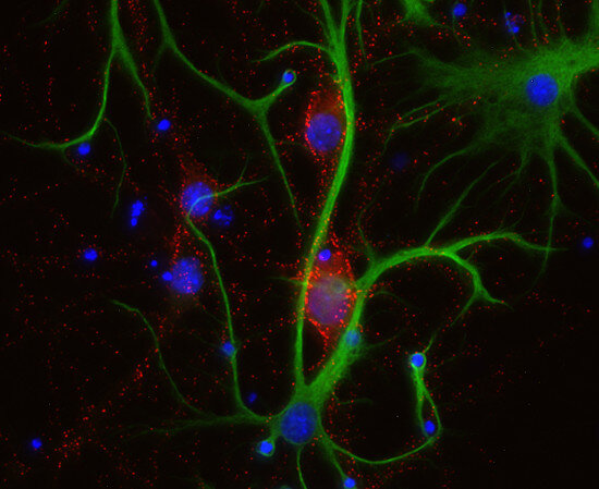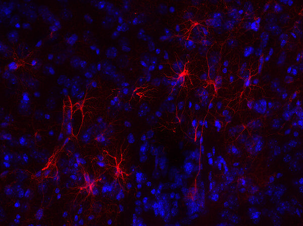 Frequently, neural stem cells also express GFAP. In addition many types of brain tumors, probably derived from astrocytic cells, heavily express GFAP. This protein is also found in the lens epithelium, Kupffer cells of the liver, in some cells in salivary tumors and others.