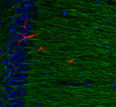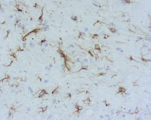 Frequently, neural stem cells also express GFAP. In addition many types of brain tumors, probably derived from astrocytic cells, heavily express GFAP. This protein is also found in the lens epithelium, Kupffer cells of the liver, in some cells in salivary tumors and others.