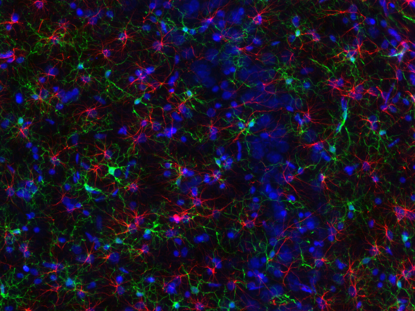 Frequently, neural stem cells also express GFAP. In addition many types of brain tumors, probably derived from astrocytic cells, heavily express GFAP. This protein is also found in the lens epithelium, Kupffer cells of the liver, in some cells in salivary tumors and others.