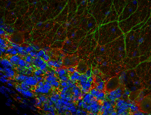 The glutamic acid decarboxylases GAD1 and GAD2, also referred to as GAD67 and GAD65 respectively, synthesize γ-aminobutyric acid (GABA), the major inhibitory neurotransmitter in the central nervous system. Therefore, GADs are widely used markers for the GABAergic system (1). The hydrophilic GAD1 can heterodimerize with the membrane achored GAD2 and a part of GAD1 is targeted to inhibitory nerve terminals by this mechanism (2). Although both proteins exhibit significant differences in their N-terminus they share high homology in the rest of the molecule (3).