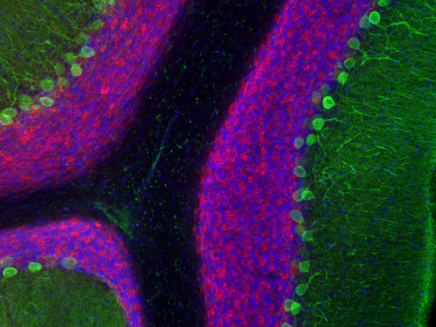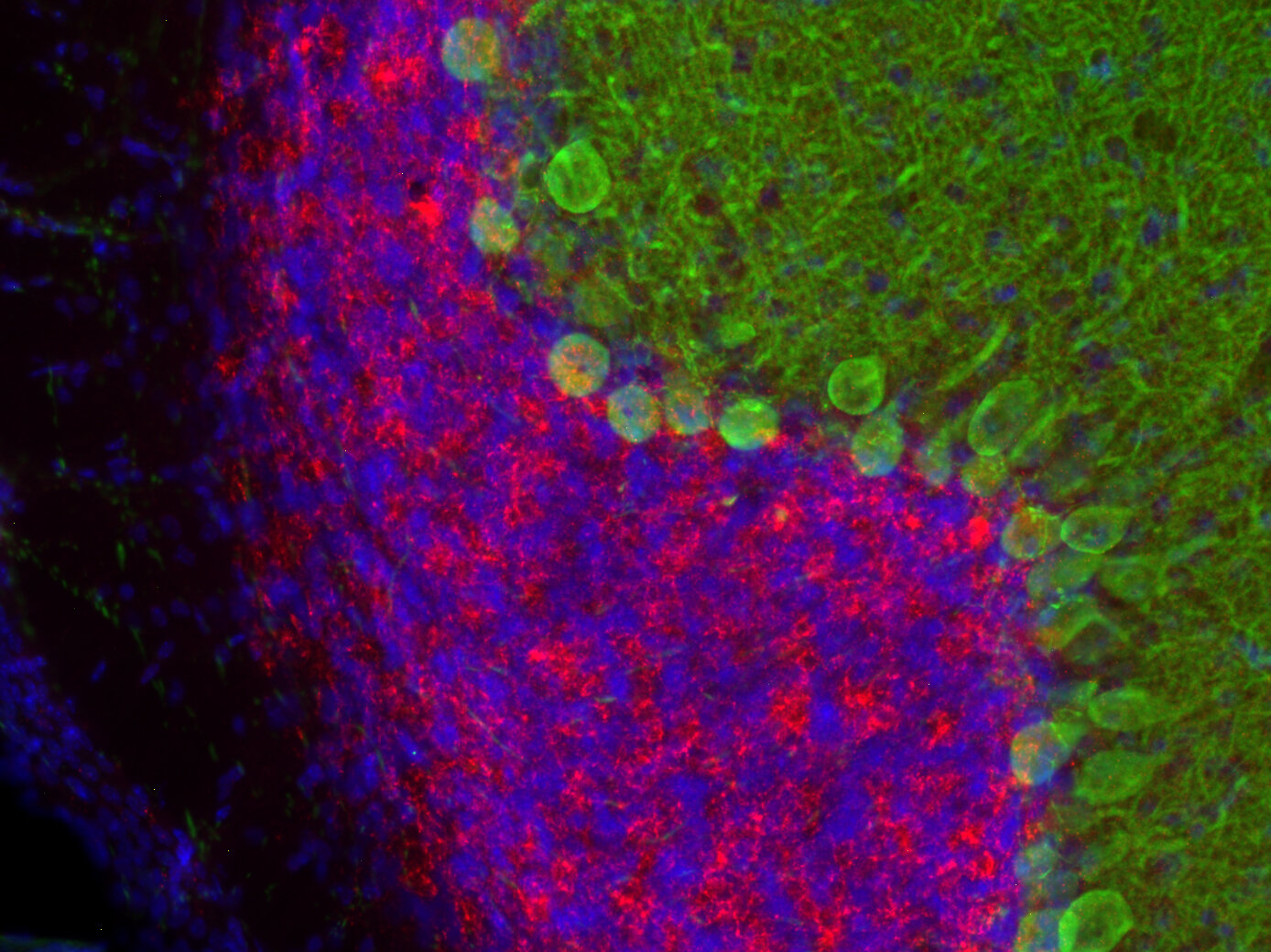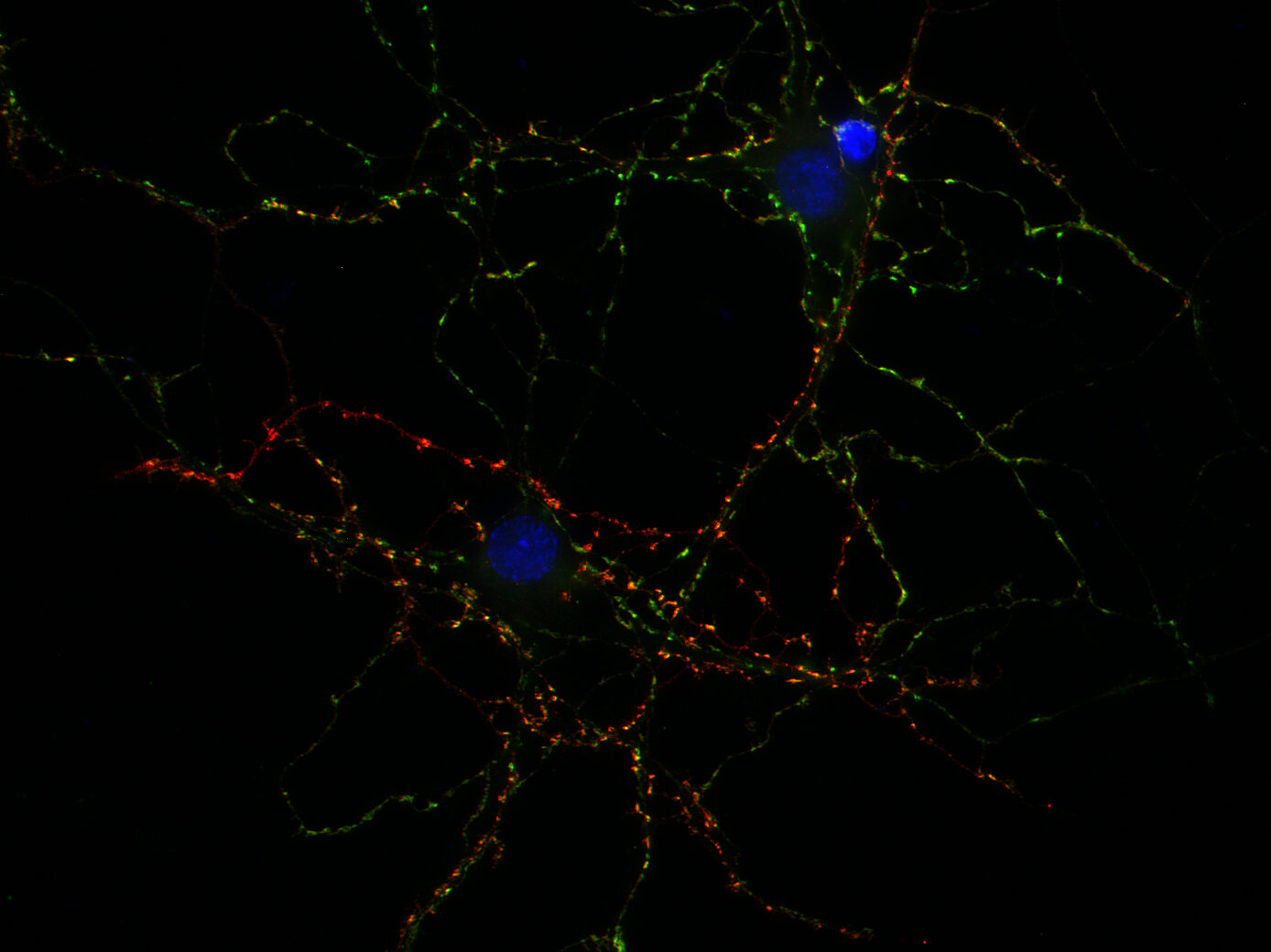 The glutamic acid decarboxylases GAD1 and GAD2, also referred to as GAD67 and GAD65 respectively, synthesize γ-aminobutyric acid (GABA), the major inhibitory neurotransmitter in the central nervous system. Therefore, GADs are widely used markers for the GABAergic system (1). The hydrophilic GAD1 can heterodimerize with the membrane achored GAD2 and a part of GAD1 is targeted to inhibitory nerve terminals by this mechanism (2). Although both proteins exhibit significant differences in their N-terminus they share high homology in the rest of the molecule (3).