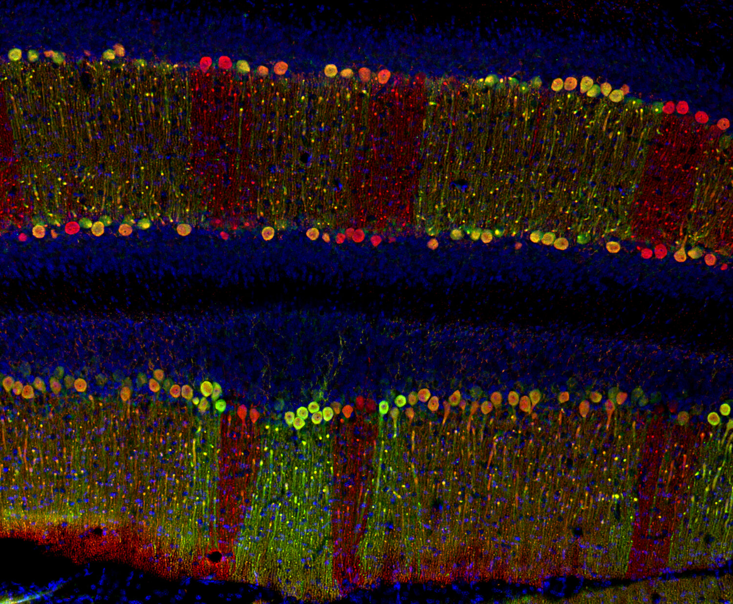 Calbindin D28k (CALB1, D28K or CAB27) and Calretinin (Calbindin D29k) are members of the EF-hand calcium-binding protein family, playing essential roles in intracellular calcium homeostasis, neuroprotection, and signal transduction (1). Calbindin D28k is widely expressed in tissues that experience high calcium influx, such as the brain, sensory organs, endocrine tissues, and the enteric nervous system (ENS). In the central nervous system (CNS), Calbindin D28k is an important marker for specific neuronal populations, particularly in Purkinje cells of the cerebellum and GABAergic and glutamatergic neurons of the cortex (2). Outside the CNS, Calbindin D28k plays crucial roles in non-neuronal tissues. In the retina, it contributes to photoreceptor function and calcium signaling (3). In the pancreas, it is present in α- and β-cells (4). Additionally, it was reported that 31% of myenteric neurons and up to 95% of submucosal neurons in the human ENS express calbindin, suggesting its involvement in both motor and secretory functions (5).