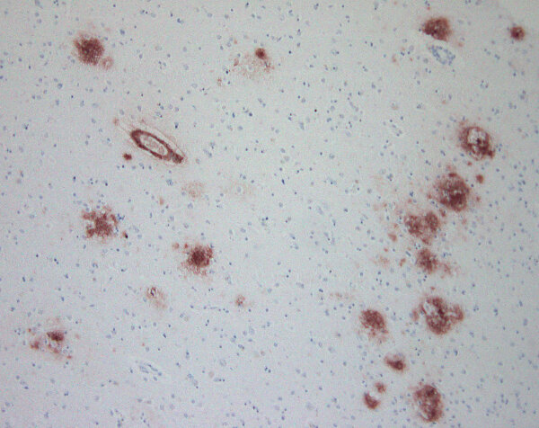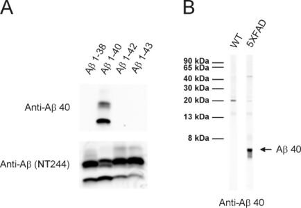 | Immunogen | Synthetic peptide corresponding to the carboxy terminal part of human Abeta40. (UniProt Id: P05067) |