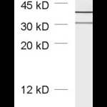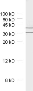 50 µg specific antibody, lyophilized. Affinity purified with the immunogen. Albumin was added for stabilization. For reconstitution add 50 µl H2O to get a 1mg/ml solution in PBS. Then aliquot and store at -20°C to -80°C until use. Antibodies should be stored at +4°C when still lyophilized. Do not freeze! |