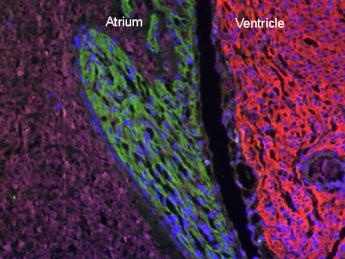 These antibodies are useful tools to distinguish between ventricle and atrium specific cardiomyocytes.
