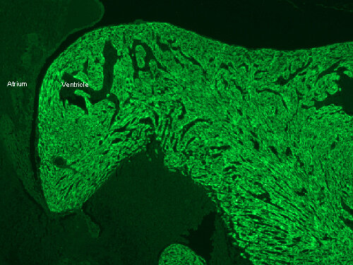 These antibodies are useful tools to distinguish between ventricle and atrium specific cardiomyocytes.