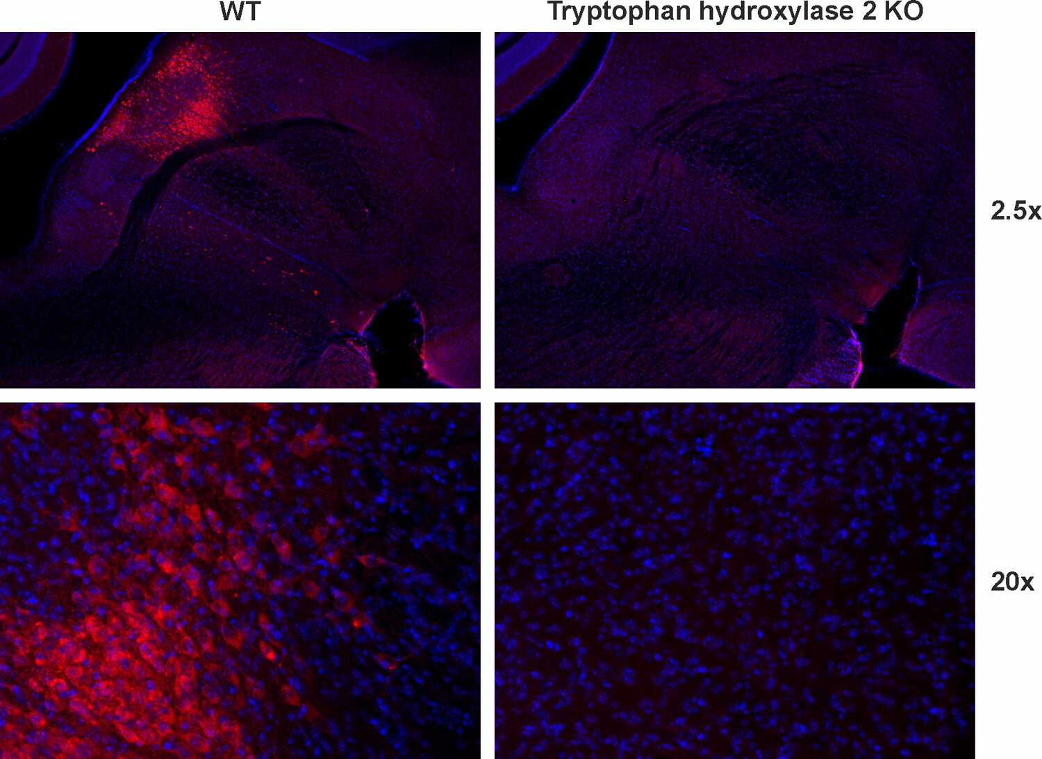 Two isoforms TPH1 and TPH2 have been described. TPH1 occurs mainly in tissues that express serotonin in the periphery (skin, gut, pineal gland). TPH2 is exclusively expressed in neuronal cell types and is the predominant isoform in the central nervous system.
