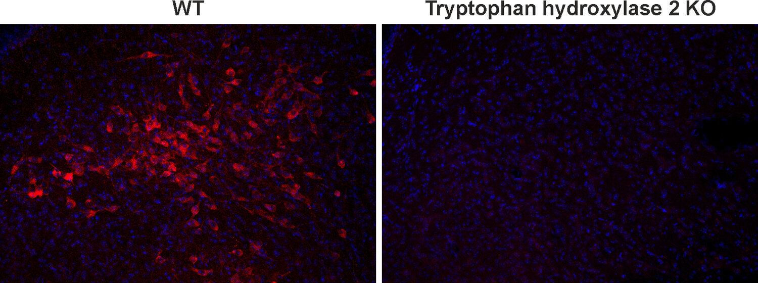Two isoforms TPH1 and TPH2 have been described. TPH1 occurs mainly in tissues that express serotonin in the periphery (skin, gut, pineal gland). TPH2 is exclusively expressed in neuronal cell types and is the predominant isoform in the central nervous system.