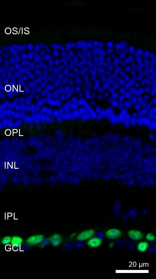 Brn3a, also referred to as POU4F1, RGC-1 or Oct-T1, is a transcription factor highly expressed in the developing peripheral sensory nervous system, in cells of the B- and T-lymphocytic lineages and in certain regions of the CNS e.g. retina, spinal cord, midbrain superior colliculus, red nucleus, nucleus ambiguus, inferior olivary nucleus and habenula. In the retina Brn3a is a well-established marker for retinal ganglion cells.