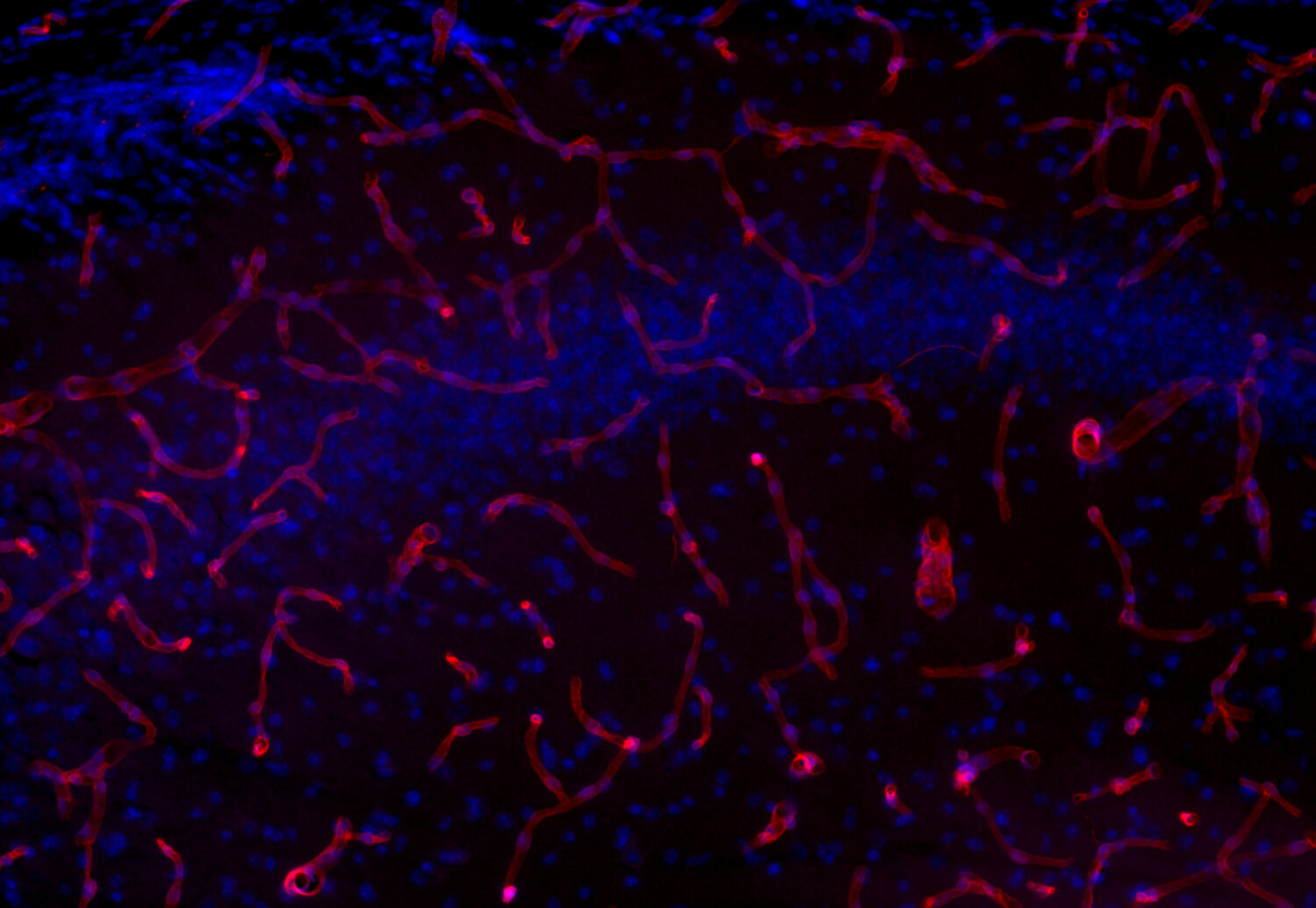 Type IV collagen is a unique member of the large collagen superfamily which in vertebrates comprises 28 different types. Unlike most collagens, type IV collagen occurs only in the basement membranes (BMs) and comprises up to six genetically distinct α-chains designated α1 (IV) to α6 (IV). Out of many potential combinations, the chains interact and assemble with a remarkable specificity to form only three distinct heterotrimers of α1α1α2, α3α4α5, and α5α5α6 (1). It has been shown that ablation of COL4 α 1/2 results in abnormal BM structure and embryonic lethality at E10.5–E11.5, although BM formation during early development is unaffected (2).