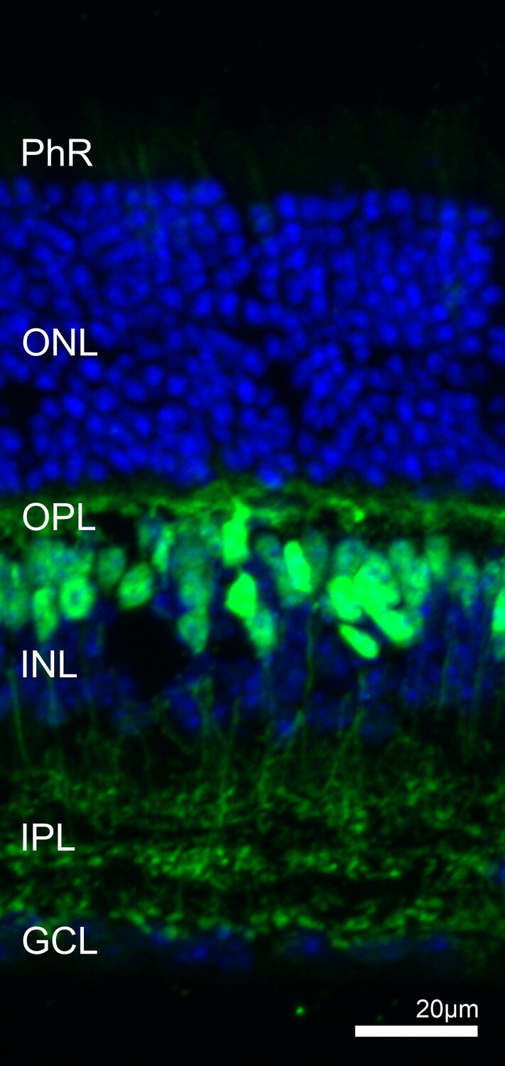 It is expressed in rod and cone bipolar cells of the retina (1) and cochlea inner hair cells of the ear (2).