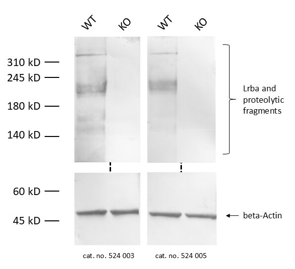 | Immunogen | Recombinant protein corresponding to residues near the central region of mouse LRBA (UniProt Id: Q9ESE1) |